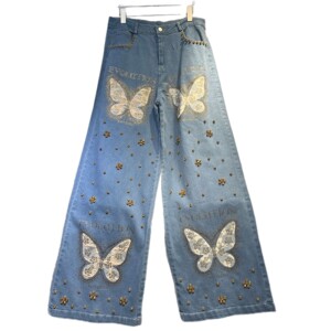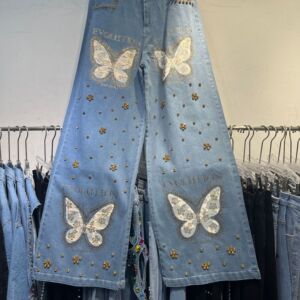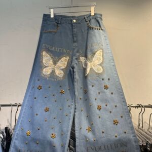 美式重工2025秋季字母蝴蝶烫钻设计牛仔裤女镶钻直筒显瘦长裤子