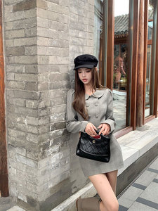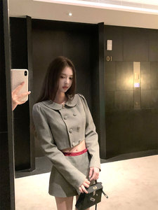 titi小姐姐【女团代表】格纹套装女秋娃娃领短外套中腰半裙两件套