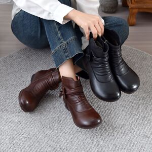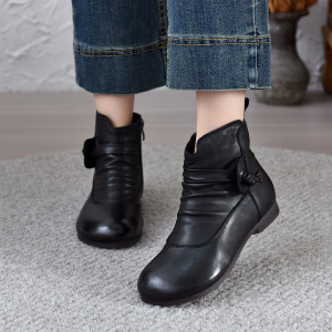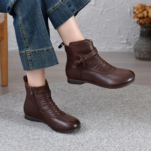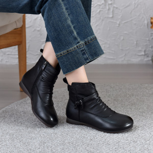 龍林2025秋冬款坡跟简约女靴头层牛皮圆头复古擦色软底软面单女靴