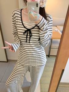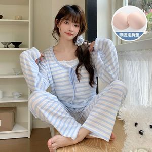 睡衣女款2025新款春秋季带胸垫长袖甜美蓝色条纹可外穿家居服套装
