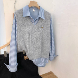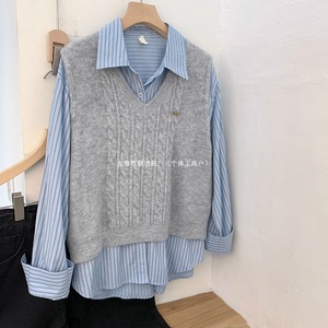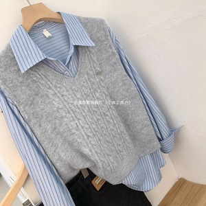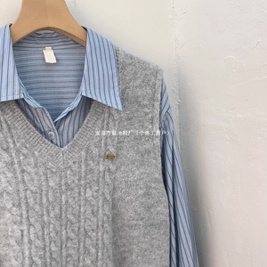 学院风灰色麻花v领针织马甲女春秋季小个子衬衫叠穿毛衣2025新款
