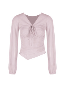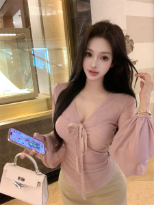 纯欲风粉色v领系带网纱长袖T恤女秋季辣妹收腰显瘦修身气质上衣