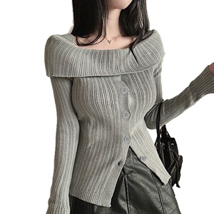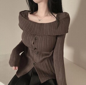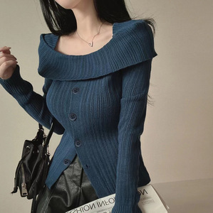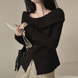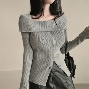 韩国chic秋季新款法式气质一字肩毛衣女修身显瘦长袖针织衫上衣