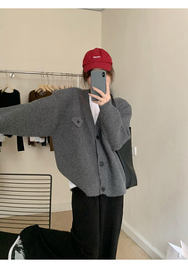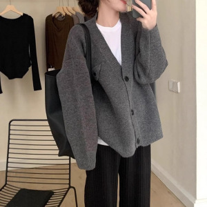 韩版慵懒风毛衣外套秋季新款设计感纯色宽松V领单排扣针织开衫女