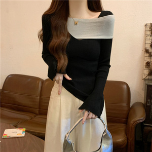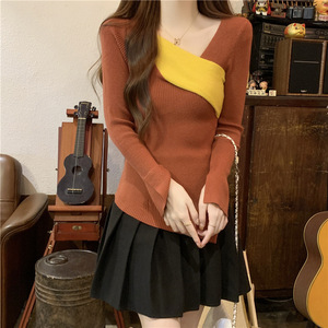秋季v领修身显瘦内搭针织衫上衣秋冬不规则拼接长袖毛衣打底衫女