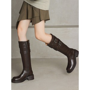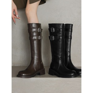 2025新款复古皮带扣粗跟中长牛仔靴牛皮西部靴长筒靴骑士靴