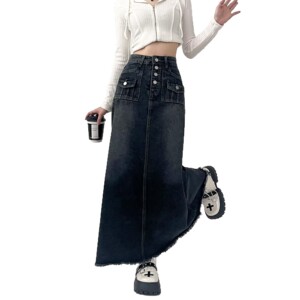 设计感牛仔裙半身裙女春秋季大码胖mm高腰复古中长款毛边a字裙子