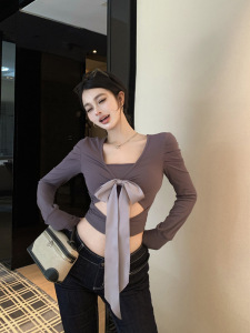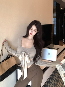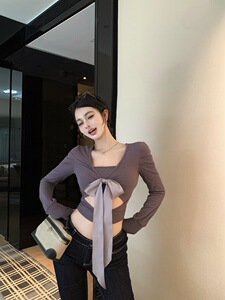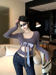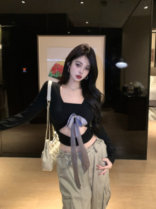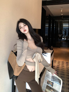 早秋长袖上衣女装辣妹V领绑带设计感拼接不规则修身显瘦长袖T恤