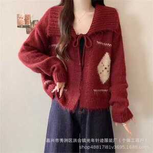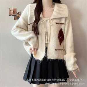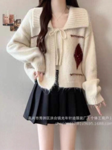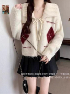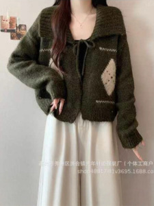新品氛围感韩系菱格翻领系带毛衣女秋冬季慵懒风宽松软糯针织开衫