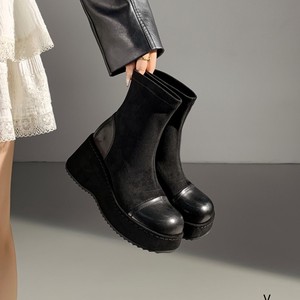 欧洲站女鞋25秋冬时尚软弹力绒布拼胎牛皮圆头舒适轻厚底套筒短靴