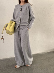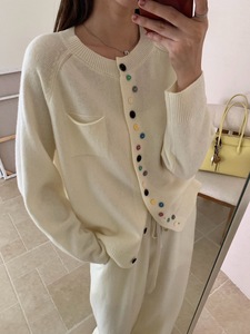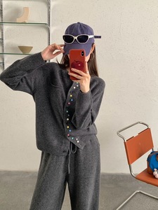 不规则彩扣100%羊毛开衫女针织长裤两件套秋冬软糯圆领单口袋套装