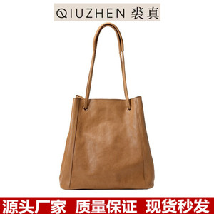 裘真水桶包女斜挎通勤大容量托特包真皮复古小众植鞣头层牛皮包包