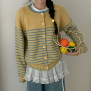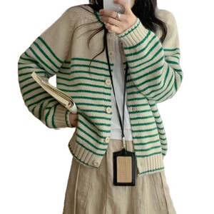 秋冬新款韩系撞色圆领条纹提花针织衫开衫女装软糯风毛衣外套上衣