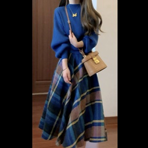 梨型身材显瘦套装女秋季时尚洋气针织毛衣炸街格子半身裙两件套