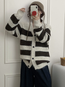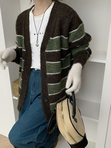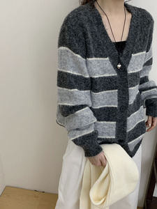 复古撞色宽条纹V领针织开衫女秋冬新款慵懒宽松软糯毛衣外套上衣