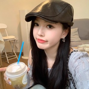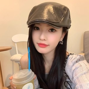 帽子女款2025新款时尚潮流皮质港风大头围前进帽复古贝雷帽显脸小