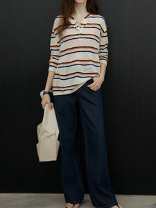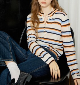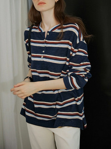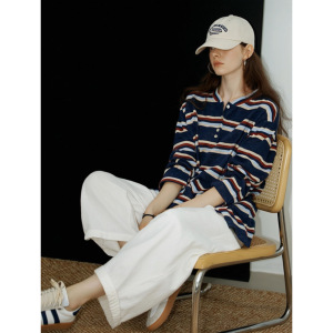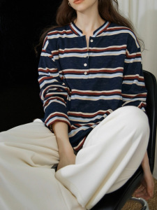 知识分子风半开亨利领宽松条纹长袖T恤上衣2025秋季新款