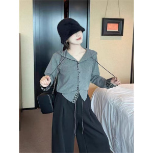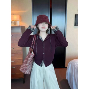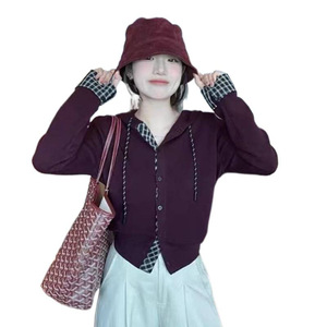 韩系灰色格纹拼接连帽长袖针织开衫女早秋独特别致超好看显瘦帽衫