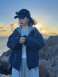 韩版时尚百搭宽松显瘦连帽假两件拼色长袖短外套女休闲上衣潮新款