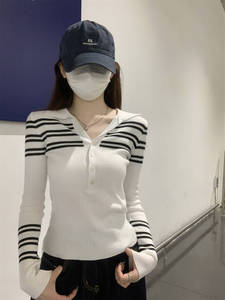 设计感撞色条纹polo翻领长袖针织衫女春秋季收腰显瘦百搭上衣毛衣