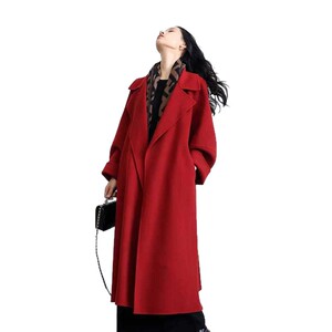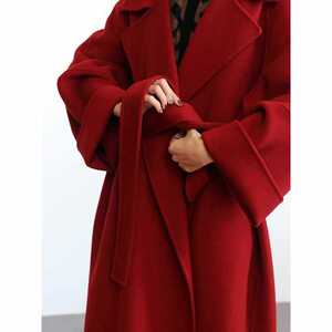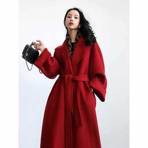 2025冬季新款红色高支羊毛双面呢红色浴袍款大衣女装宽松长款外套