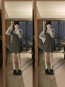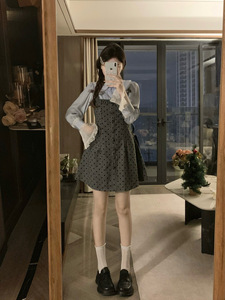 大码女装波点早秋拼接穿搭连衣裙+蓝色衬衣显瘦两件套