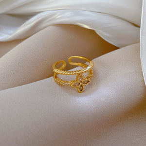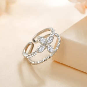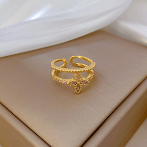 跨境四叶花开口双层戒指女时尚微镶轻奢指环食指戒网红同款冷淡风