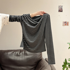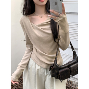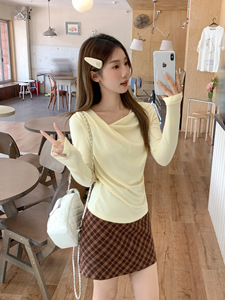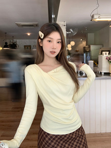 奶黄荡领打底衫女内搭秋冬纯欲修身独特别致设计感一字肩T恤上衣
