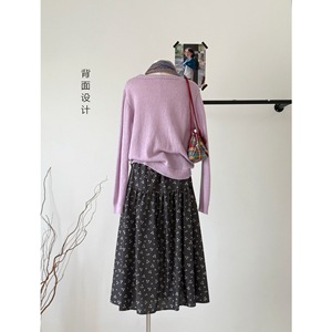 2025秋季新款温柔慵懒V领单排扣针织开衫+碎花半身裙+围巾三件套