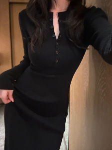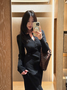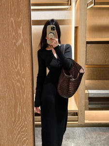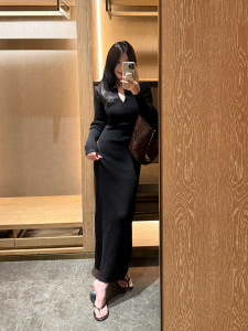 FOX ROOM 亨利领修身显瘦连衣裙2025秋季新款修身黑色长裙Y168