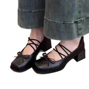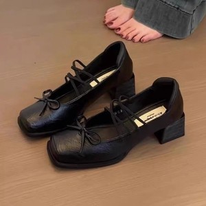 法式粗跟芭蕾舞单鞋小皮鞋2025新款蝴蝶结浅口复古方头玛丽珍鞋女