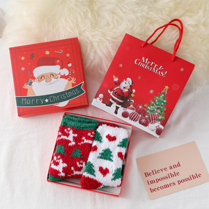 2双礼品盒装珊瑚绒圣诞女袜加绒保暖中筒圣诞老人袜子圣诞树袜子