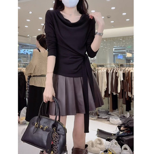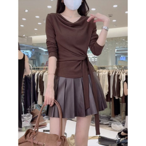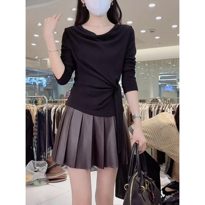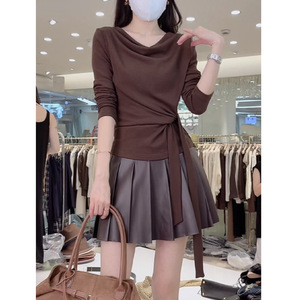 高级感荡领长袖t恤女装早秋季新款时尚气质洋气减龄系带收腰上衣