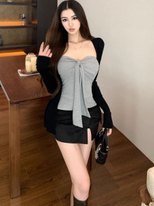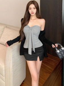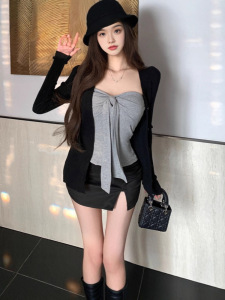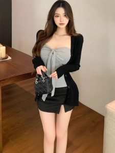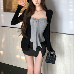 纯欲风灰色绑带抹胸背心长袖开衫外套女秋季设计感辣妹套装两件套