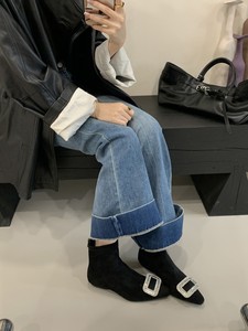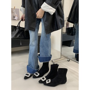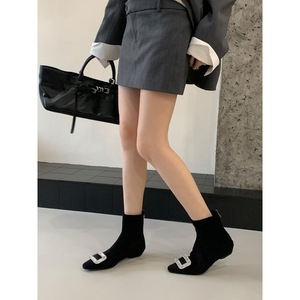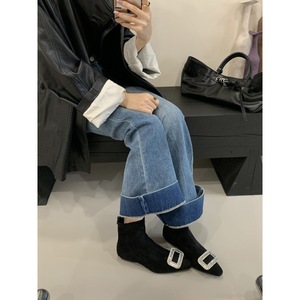 2025内增高短靴女春秋单靴水钻方扣绒面百搭后拉炼短筒瘦瘦靴