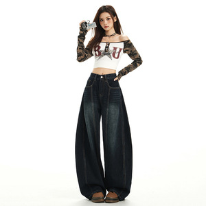 美式复古刺绣弯刀阔腿牛仔裤女秋季新款高腰直筒宽松拖地裤