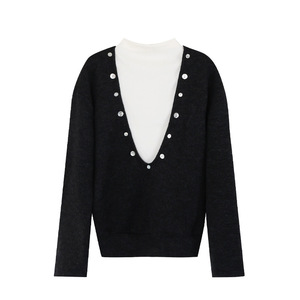 爱西里2025秋季简约v领手工贝壳装饰针织衫+百搭背心套装女A1603