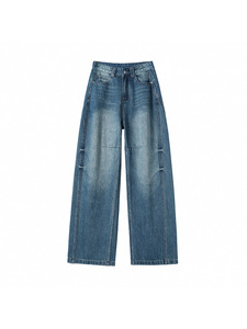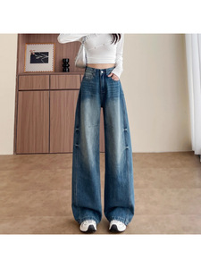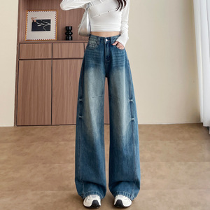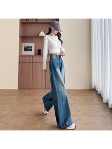 复古扎花阔腿牛仔裤女2025秋季流行超火宽松遮肉梨型身材拖地裤子