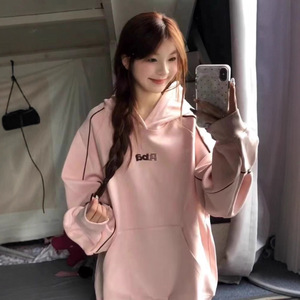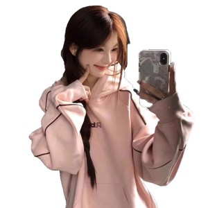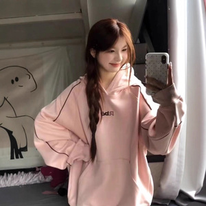 学院风粉色连帽加绒卫衣女秋冬美式oversize慵懒宽松加厚外套上衣
