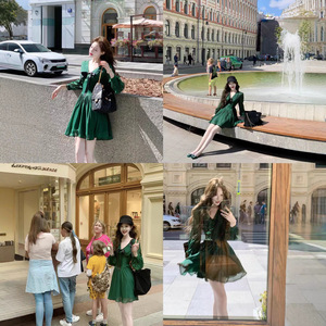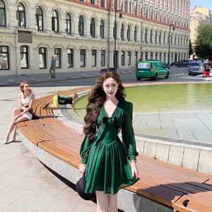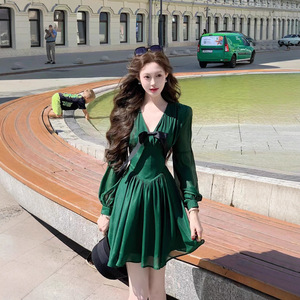 吃绿色菜莉莉丝 新品88折法式蝴蝶结v领长袖收腰显瘦连衣短裙