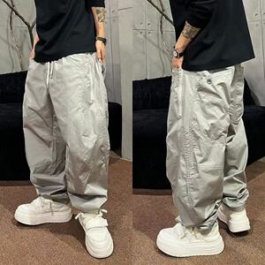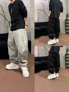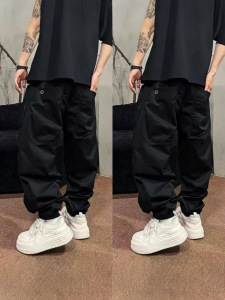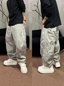 秋季高街弯刀多口袋拼接线条抽绳阔腿宽松休闲长裤时尚百搭轻奢