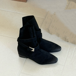 磨砂牛皮复古套筒方头短靴女2025秋冬新款皮带扣粗跟束口时装靴潮
