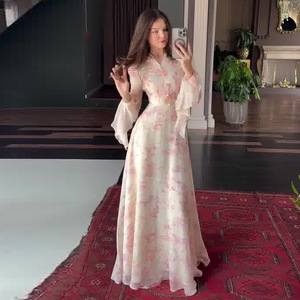 2025年秋季新款女装欧美亚马逊跨境外贸法式收腰荷叶边粉色连衣裙