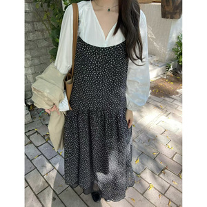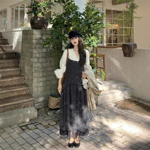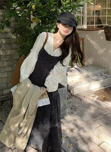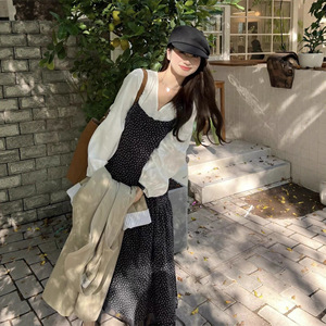 实拍 秋季韩版甜美设计感V领泡泡袖衬衣+吊带波点连衣裙两件套装