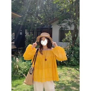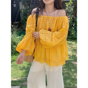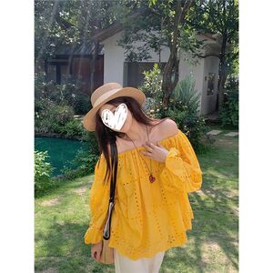 设计感独特气质黄色镂空一字肩长袖衬衣女装夏季小众宽松衬衫上衣