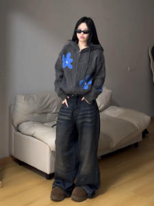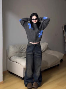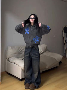 韩系灰色拉链连帽针织衫开衫毛衣女秋冬季感慵懒宽松外套上衣