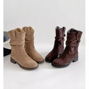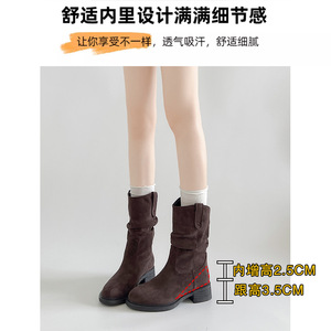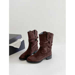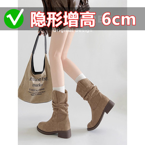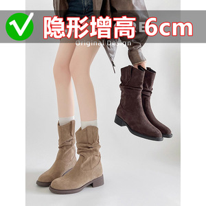 真皮~ 美拉德短靴女秋新款复古马丁靴粗跟堆堆靴内增高西部牛仔靴