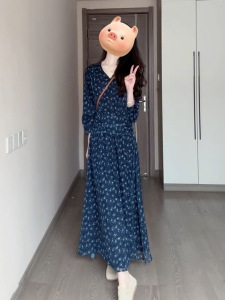 法式气质感蓝色v领碎花连衣裙子女秋2025新款小个子收腰长裙