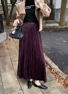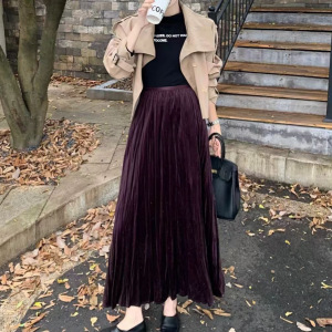 简约高腰显瘦百褶丝绒裙女2025秋冬新款宽松A字中长款半身裙子潮