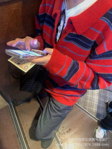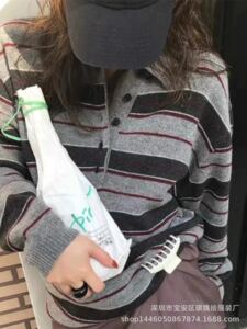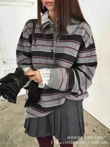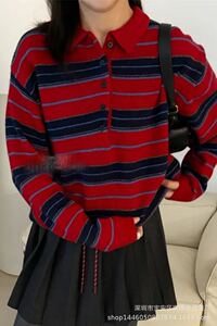 琪镌绘制2025年秋季款韩系慵懒宽松显瘦条纹翻领女长袖毛衣88210